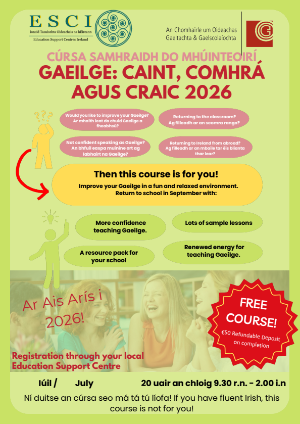 Is cúrsa samhraidh praiticiúil agus taitneamhach é Gaeilge: Caint, Comhrá agus Craic 2026 do mhúinteoirí ar mian leo a gcuid muiníne a fhorbairt i labhairt agus i múineadh na Gaeilge. Cuirtear an cúrsa ar fáil i dtimpeallacht chairdiúil, shuaimhneach thacúil, agus dírítear ar fheabhsú na Gaeilge labhartha laethúla chomh maith le hacmhainní praiticiúla agus samplaí ceachtanna don seomra ranga. Fillfidh rannpháirtithe ar scoil i mí Mheán Fómhair le muinín nua, fuinneamh athnuaite agus pacáiste acmhainní le tacú lena gcuid múinteoireachta.