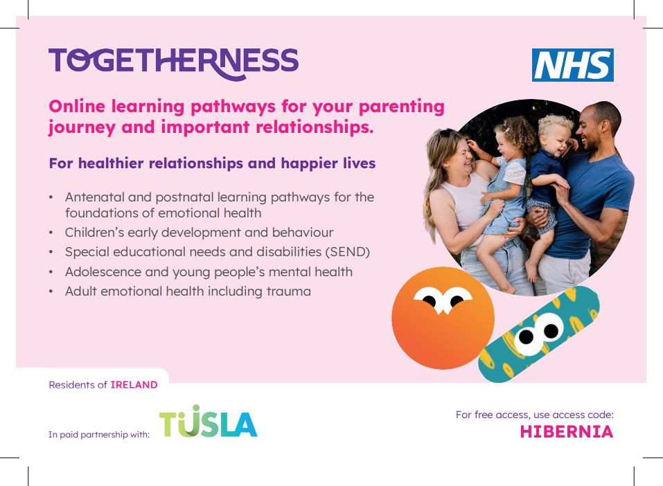 Tusla has purchased on a new resource available to every parent and carer in the country funded by Tusla the child and family agency. Togetherness has developed online pathways which help parents learn about big feelings, brain development, behaviour, and how relationships can care for wellbeing.