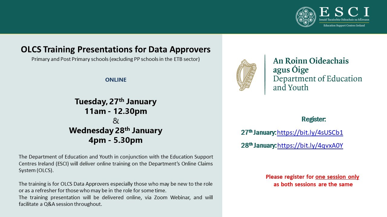 The Department of Education and Youth in conjunction with the Education Support Centres Ireland (ESCI) will deliver online training on the Department’s Online Claims System (OLCS).
